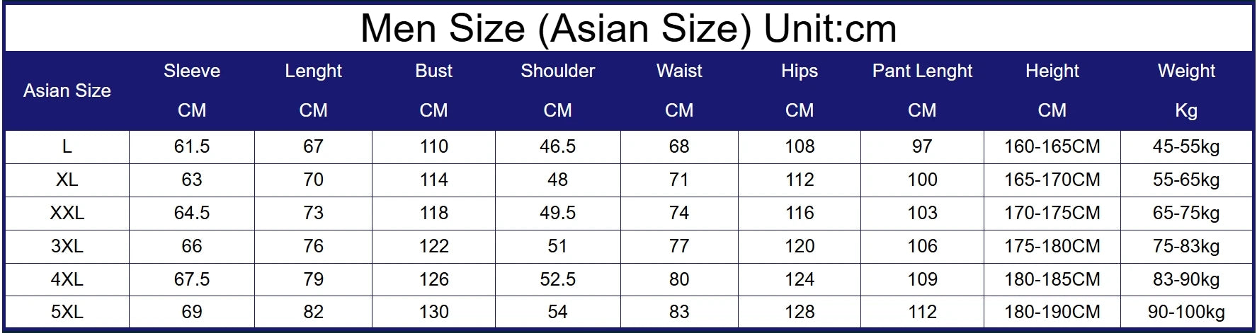 Sizes: Asian Size L,XL,XXL,XXXL,4XL,5XL,please check the size table,there has height and weight advices.
